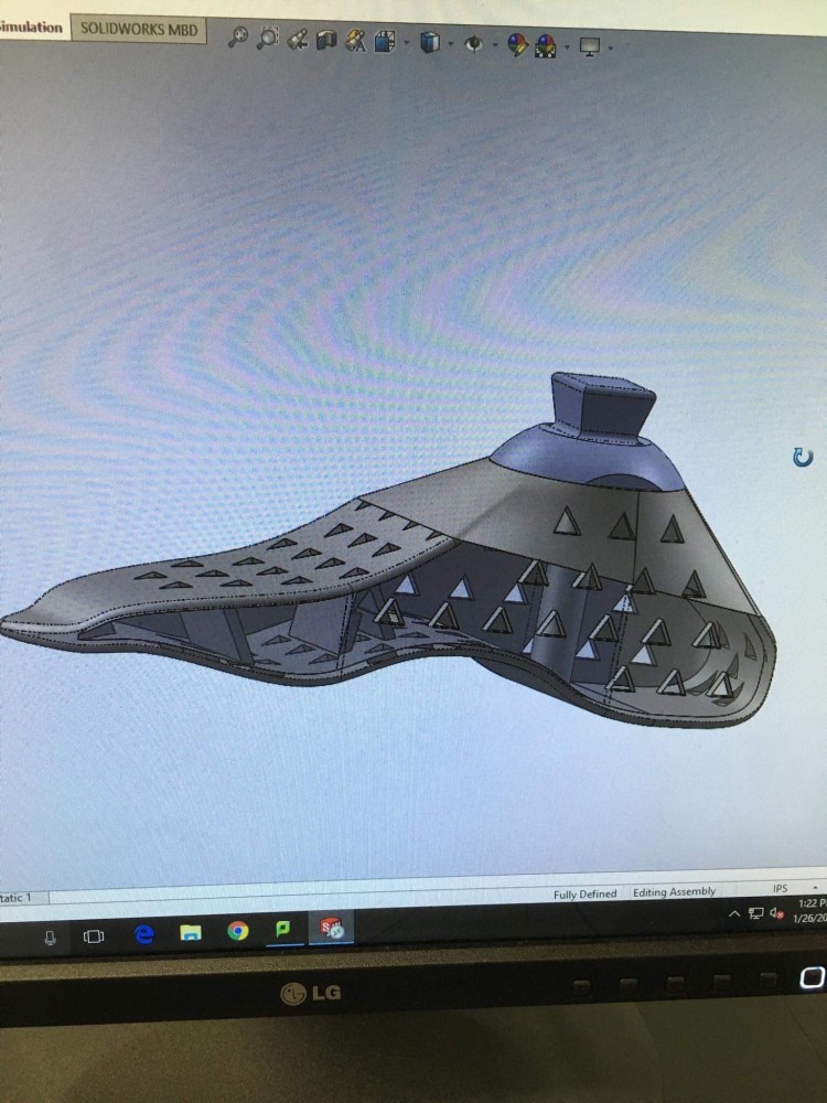 This is a project I started helping with in 2018. The goal is to design, prototype and manufacture an advanced prosthetic rock climbing shoe that addresses the desire for an aggressive toe and heel that current models don’t have. Currently our team has created a Solidworks model, a plastic model, and finally a 3D printed lightweight steel model. The steel component has held up excellently on the rock climbing wall; however, the rubber is starting to peel off due to the uneven stresses between the rubber sole and the metal shoe.