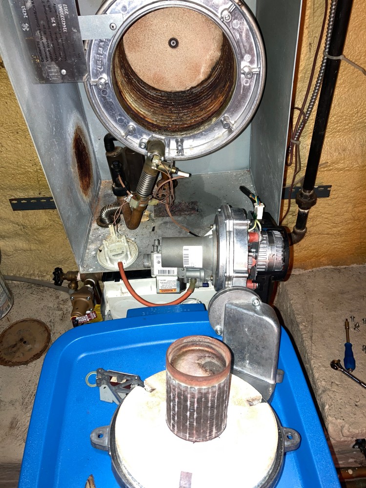 The full system was inspected and had a lot of dirt retained in the system. The system was vacuumed, and the condensate p-trap was cleaned. The flue gas gasket was re-sealed with gorilla glue. The air-gas venturi was vacuumed and air was blown in to release trapped dirt. Initially the fan bearings were cleaned and oiled and the fan was working but soon it clogged up again and would not spin freely. Once the fan was replaced there were no issues. The exhaust return flapper was also replaced.