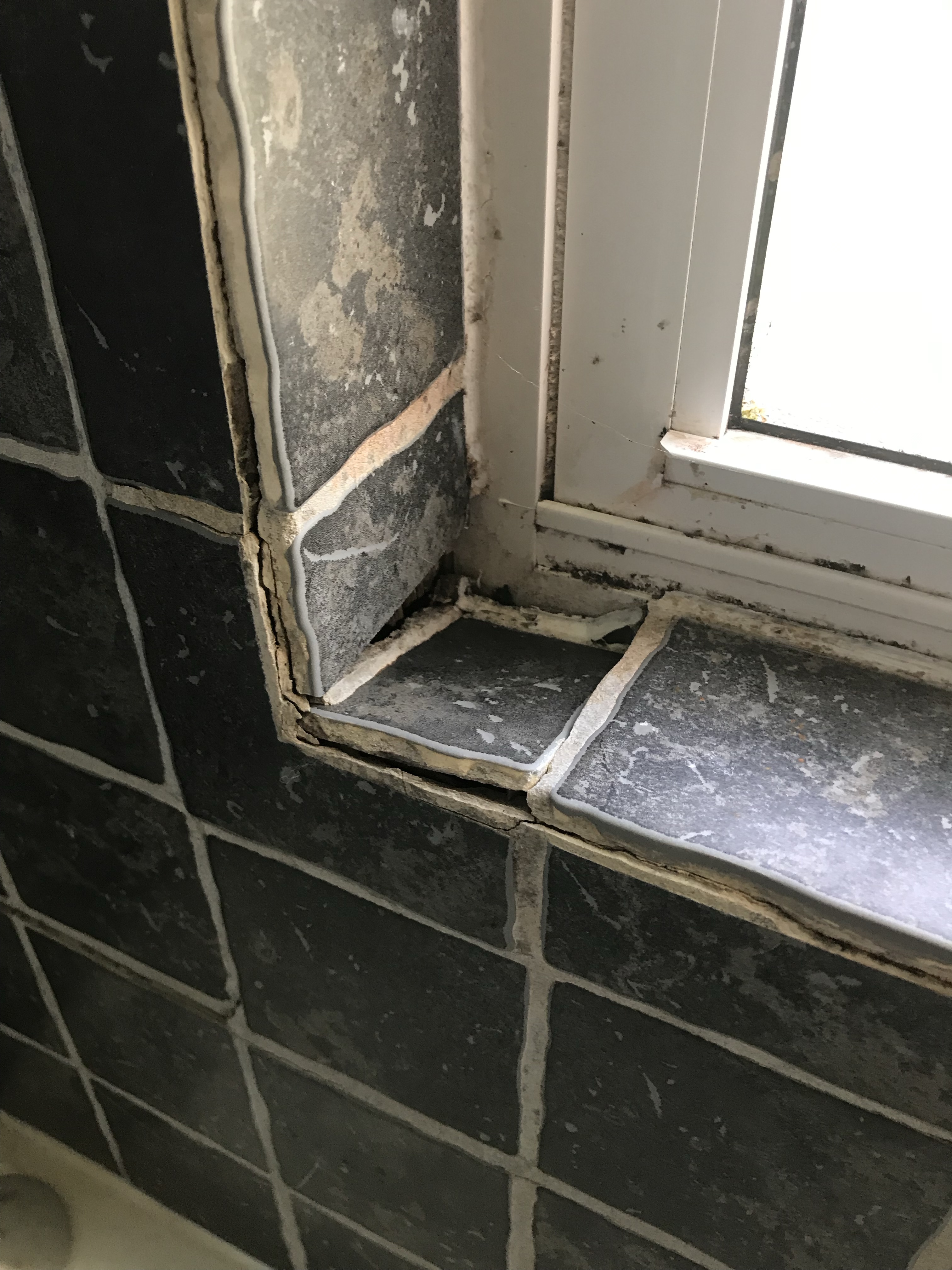 The cracked window sill led directly behind the wall. The moisture from the shower led to the wood structure rotting and causing other tiles to break loose. All of the affected area was removed up to the unaffected area. The wood structure was rebuilt with 2x4s, and a water resistant drywall layer was added on top and caulked in. Grout was added and fresh spare tiles were added on top and spaced evenly. More grout was added between the tiles, and final caulking was added. Since time was a factor, the whole shower was not redone with water-resistant drywall. This raises the risk of further damage later on, but will be sufficient for a long time.
